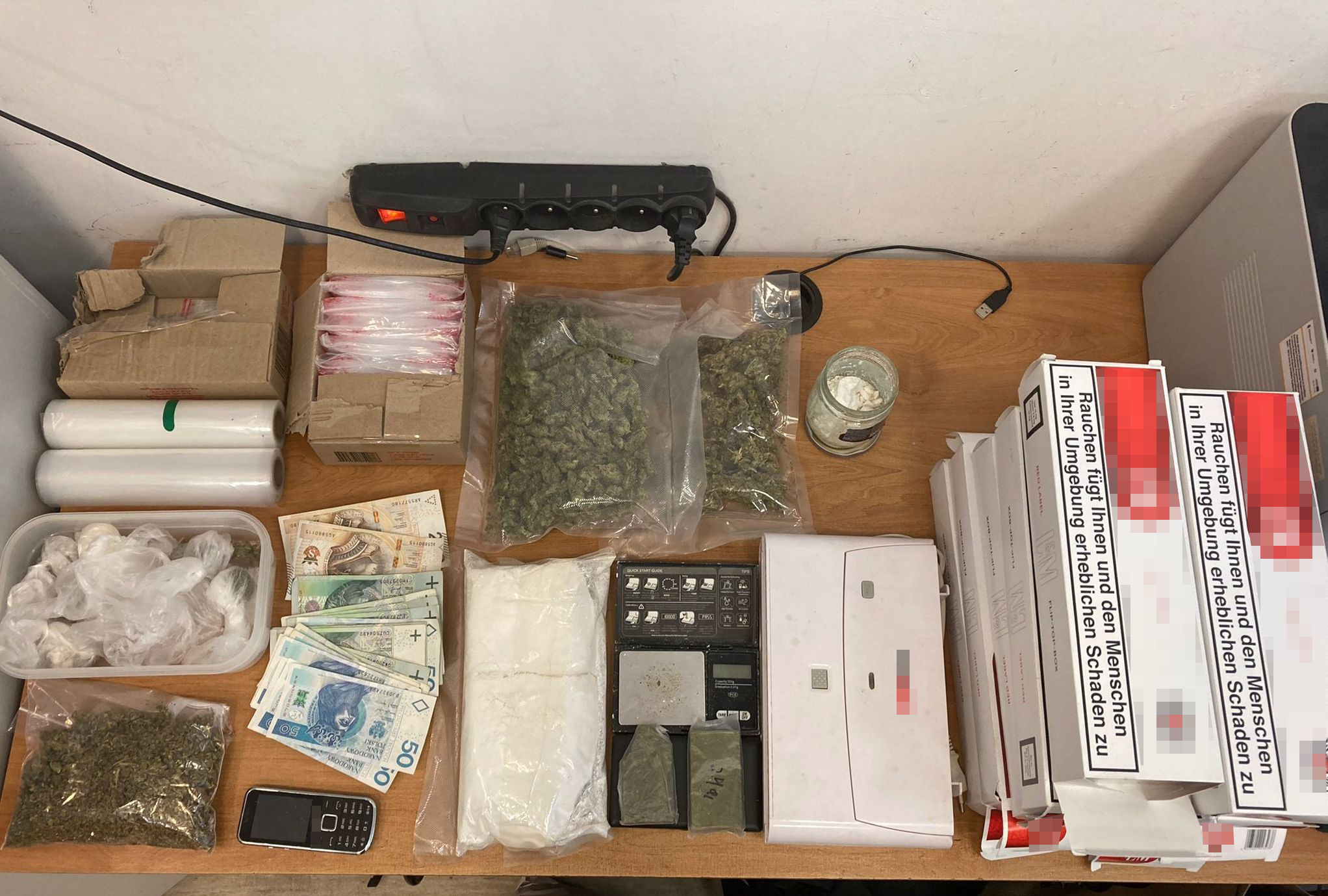 W mieszkaniu zajmowanym przez 32-latka policjanci zabezpieczyli worek z zawartością ponad kilograma białej zbrylonej substancji oraz słoik z 77 gramami tego samego środka. Przeprowadzone wstępne badania narkotesterem potwierdziły, że jest to amfetamina. Na tym jednak nie koniec. Kolejne worki lub zawiniątka z zabronionymi substancjami policjanci zabezpieczyli zarówno w mieszkaniu jak i garażu. W tym ostatnim były worki strunowe z m. in. 157 gramami suszu roślinnego czy ponad 20 gramami haszyszu.  Tam też ujawnionych zostało 100 paczek papierosów bez polskich znaków akcyzy. Łącznie policjanci zabezpieczyli niemal 1,5 kilograma różnego rodzaju narkotyków: amfetaminy, marihuany, haszyszu oraz 3-CMC (metaklefedornu), a także wagi elektroniczne, telefony komórkowe, pieniądze czy woreczki strunowe. 32-letni „właściciel” zabronionych środków został zatrzymany i trafił do policyjnego aresztu. Po zgromadzeniu materiału dowodowego policjanci przedstawili mężczyźnie zarzut dotyczący posiadania znacznej ilości narkotyków.
