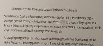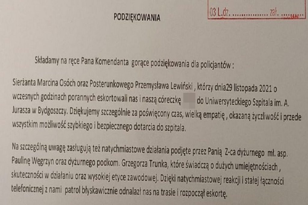 Policjanci z komisariatu na bydgoskich Wyżynach zapewnili pilotaż do Szpitala im. Jurasza w Bydgoszczy kierowcy, który wraz z żoną wiózł krwawiące dziecko. Dzięki pomocy funkcjonariuszy szybko trafiło ono pod opiekę specjalistów. Wdzięczni rodzice wraz z córką w skierowanym liście podziękowali policjantom za pomoc.
